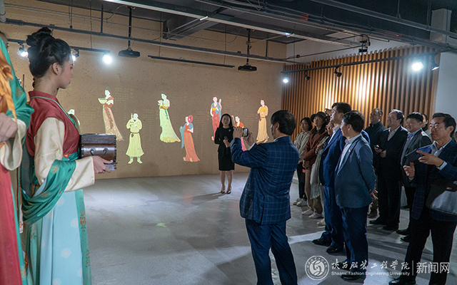 徐彬首先介绍了校史馆和数字艺术馆。校史馆展示了陕西服装工程学院二十五年的历史。数字艺术馆分设“中国纺织服装70周年”、“历届学生优秀设计作品”、“周秦汉唐历史文化精粹”、“丝绸之路艺术特展”、“苗绣特展”、“国际拼布艺术特展”等展馆。数字艺术馆内设沉浸影院。