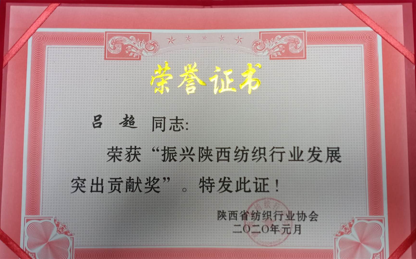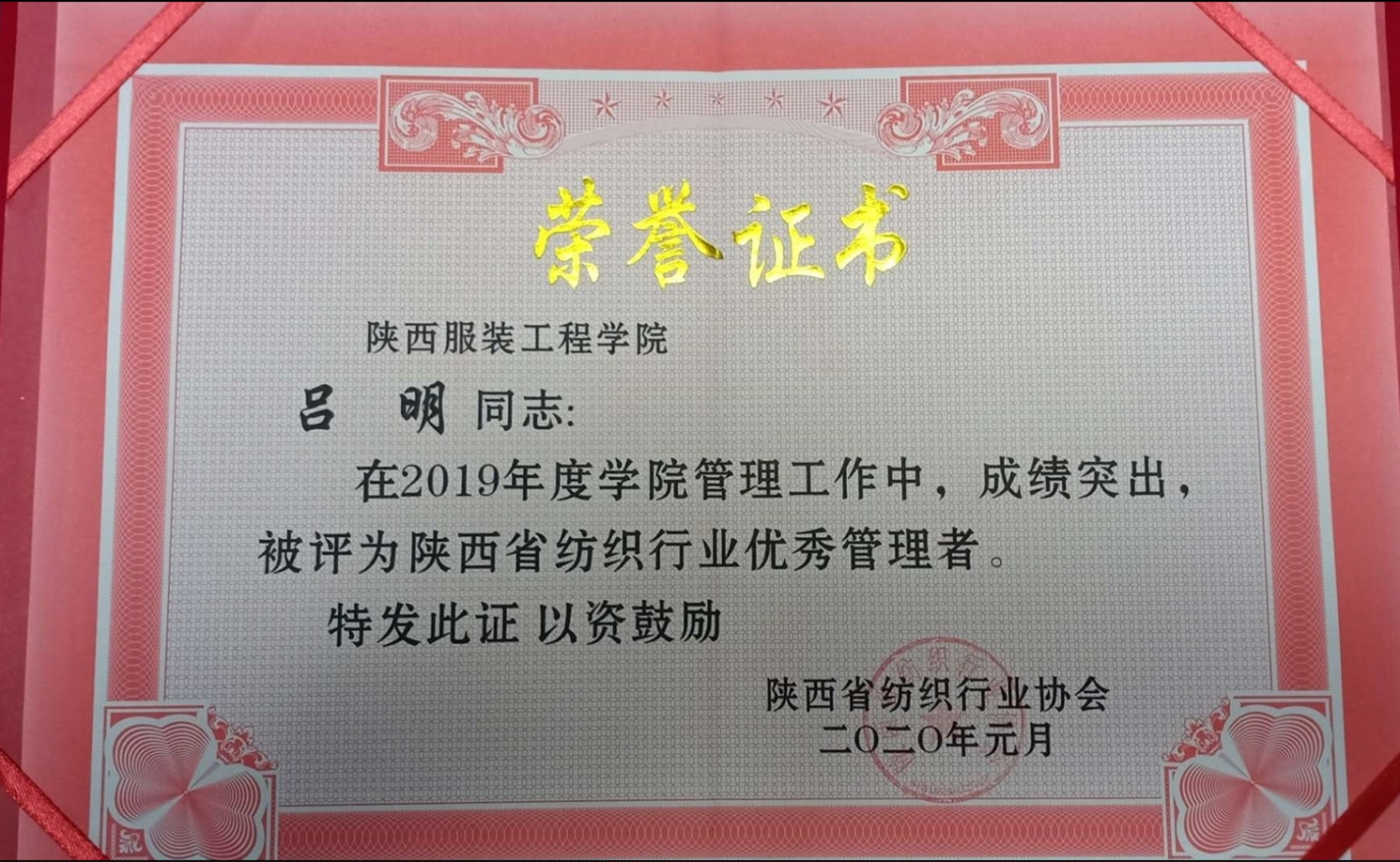 我校为陕西省纺织协会成员单位,在2019年国内复杂多变的纺织行业形势下,我校继续发扬艰苦奋斗、奋力拼搏实干精神,为全省纺织行业创新发展做出应有贡献,使全省纺织行业走向了高质量快速发展的道路。近日,陕西省纺织行业协会决定对在2019年度做出突出贡献的一批先进集体及先进个人进行表彰,我校董事长吕明博士荣获2019年度“陕西省纺织行业优秀管理者”先进个人称号。