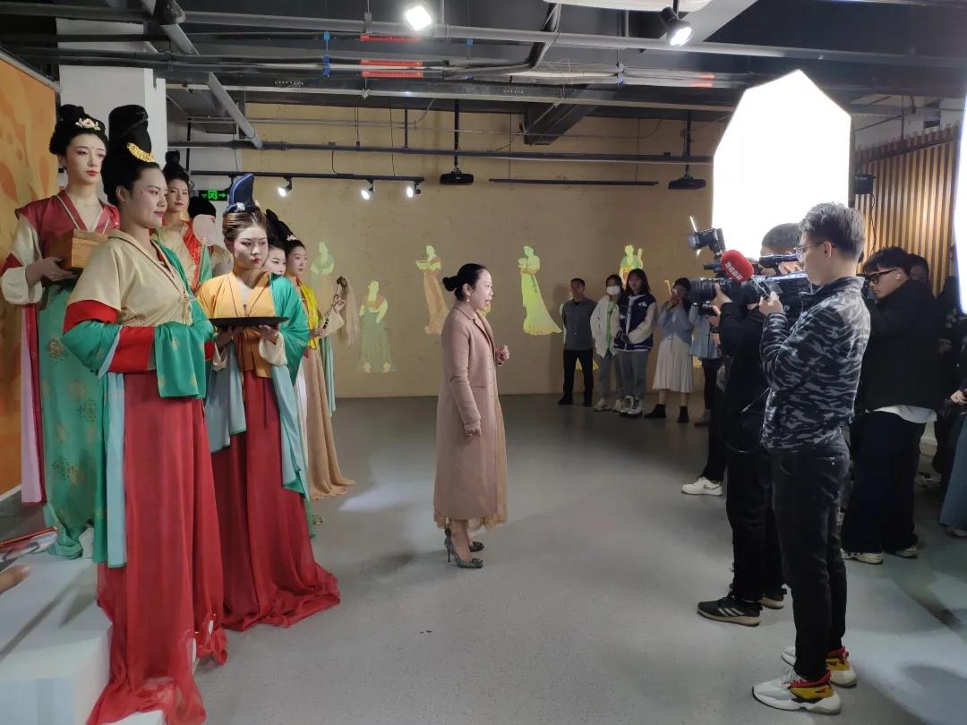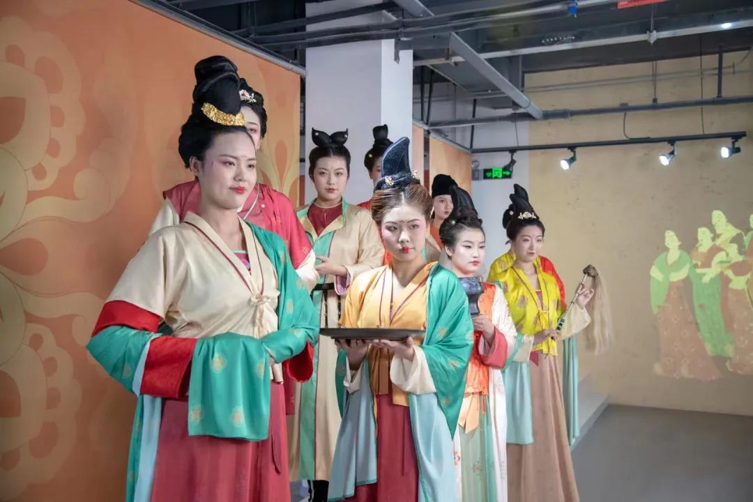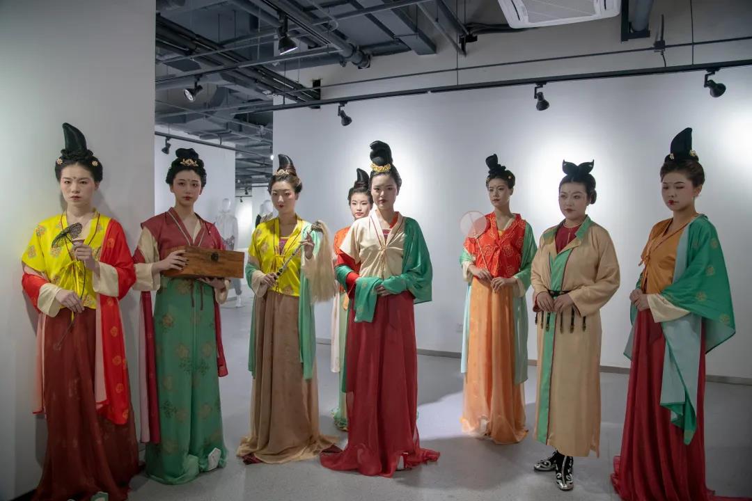 据了解,在老师的指导下,我校服装设计专业的学生实地参观永泰公主墓,研究九宫女图,用一年半的时间将唐代短襦、高腰裙、半臂以及披帛等服饰进行一一再现,惟妙惟肖。