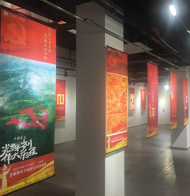 近100幅参展作品主要以师生联展为主,集合招贴设计、摄影、剪纸等多种艺术形式与党史元素进行完美融合,内容以庆祝中国共产党成立100周年为核心,以美为媒,充分展示师生的聪明才智、艺术设计天赋,用现代美术艺术表达感恩祖国、感恩党的主题,凸显思政课程、课程思政的实施效果及党史学习教育成果,用自己的方式向党的生日献礼。