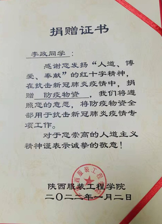 李政同学看到我校防疫工作人员十分辛苦,就决定用自己暑期社会实践收入买一批防疫物资捐给学校,表达自己对学校和防疫工作人员的感激之情。他的父母跟哥哥都很支持他,于是,他的哥哥用专车跨越600公里把李政同学购买的物资送到了学校。