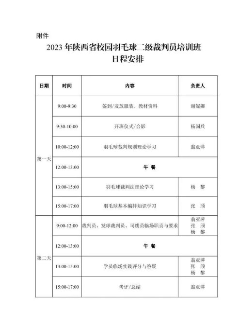各有关学校:为贯彻落实陕西省教育厅 陕西省体育局《关于深化体教融合 促进青少年健康发展的实施意见》 《关于印发2023年陕西省学生体育竞赛活动计划的通知》精神,根据省学生体育协会培训计划安排,陕西省学生体育协会、陕西省乒乓球羽毛球网球运动管理中心决定举办2023年陕西省校园羽毛球二级裁判员培训班。现将有关事项通知如下:一、主办单位陕西省学生体育协会陕西省乒乓球羽毛球网球运动管理中心