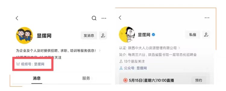 关注“显摆招聘”公众号可接收开播提醒~