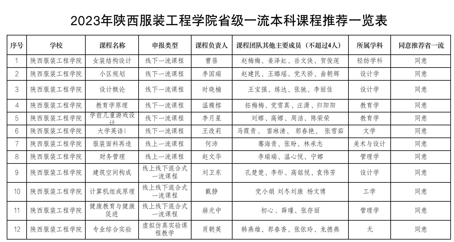 根据陕西省教育厅《陕西省教育厅办公室开展第三批省级一流本科课程认定的通知》就(陕教高办〔2023〕42号),现对2023年陕西服装工程学院推荐国家级、省级一流本科课程予以公示。