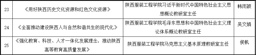 陕服新闻网讯( 菅建伟)为进一步推动学习贯彻习近平新时代中国特色社会主义思想主题教育走深走实,深入学习贯彻习近平总书记在听取陕西省委和省政府工作汇报时的重要讲话精神,根据中共咸阳市委讲师团《关于征集学习贯彻习近平总书记在听取陕西省委和省政府工作汇报时的重要讲话宣讲专题的通知》,我校马克思主义学院教师侯帆、吴文娟、韩雨颖选报的宣讲题目《强化教育、科技、人才一体化发展理念,推动陕西高等教育高质量发展》《全面推动建设陕西人与自然和谐共生的现代化》《用好陕西历史文化资源和红色文化资源》入选咸阳市“菜单式”宣讲专题。