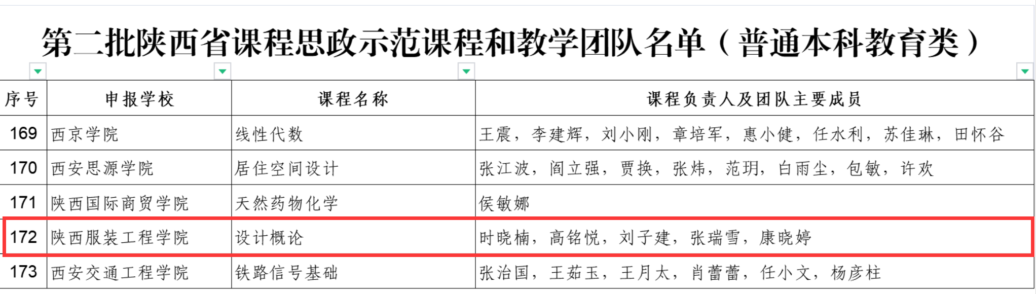 陕服新闻网讯(教务处)近日,陕西省教育厅发布了《关于公布第二批陕西省课程思政示范课程、教学团队和教学研究示范中心认定结果的通知》(陕教〔2023〕264号),我校时晓楠教授主讲的《设计概论》课程及其教学团队获批陕西高校课程思政建设示范课程和教学团队。