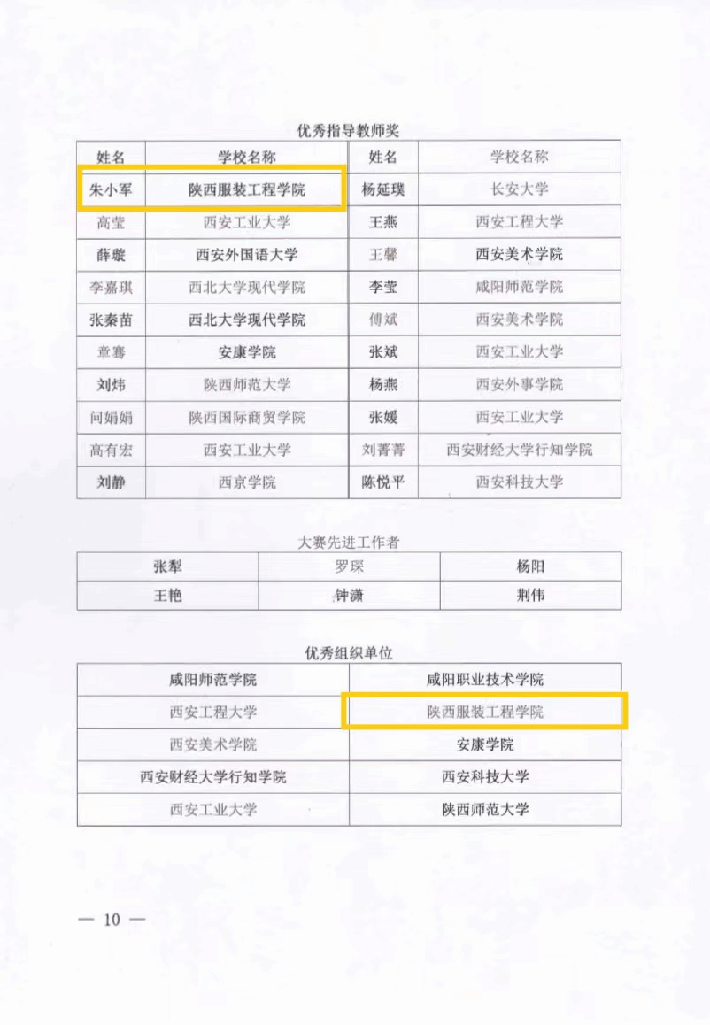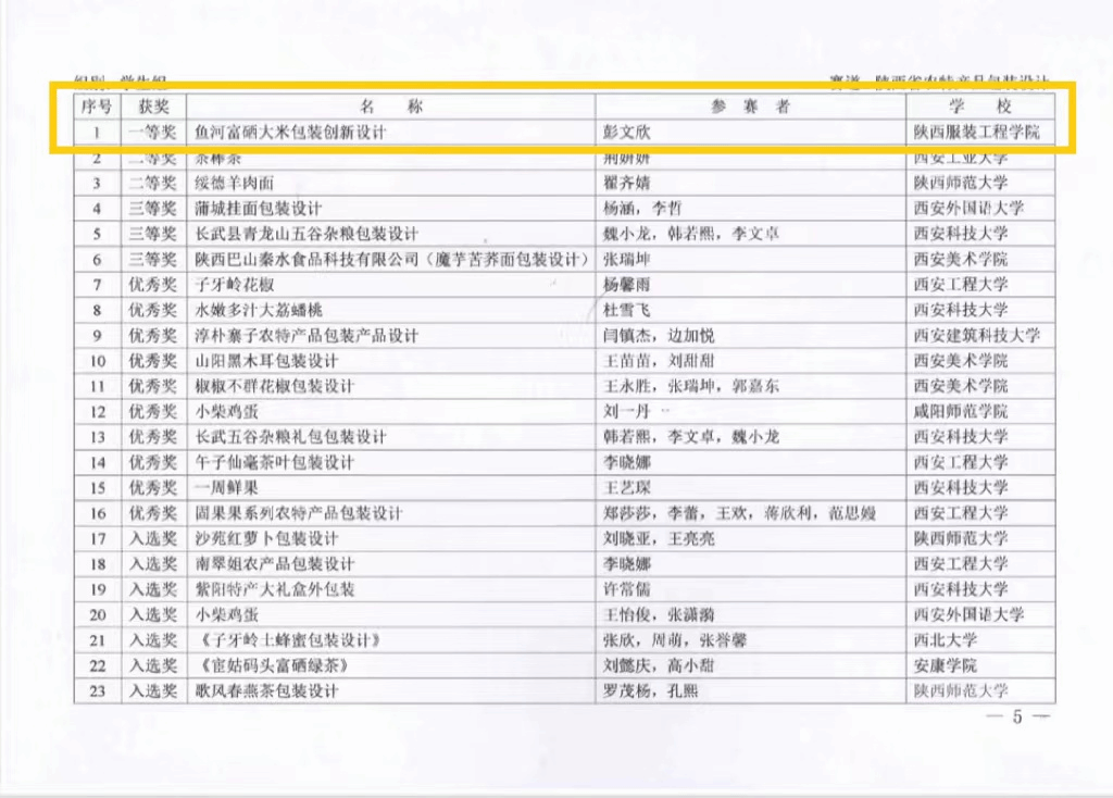 本届大赛由陕西省委教育工委、省教科文卫体工会主办,西安美术学院承办,省内52所高校1695组作品参赛。我校学生彭文欣作品《鱼河富硒大米包装创新设计》获得陕西省农特产品包装设计学生组一等奖;学生王琦帅作品《秦岭蜂业品牌形象再设计与应用》获得陕西省农特产品包装设计学生组入选奖;学生马梓萌作品《小柴鸡蛋》、学生张航作品《太白山珍标志设计》获得陕西省农特产品品牌标志命题设计学生组入选奖。朱小军老师获得优秀指导教师奖。学校获得优秀组织单位奖。