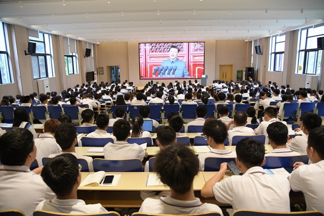 习近平总书记在庆祝中国共产党成立100周年大会上发表的重要讲话,回顾了中国共产党团结带领中国人民不懈奋斗的光辉历程,展望了党和人民事业发展的光明前景,以非常深沉的历史使命感,聚焦于党的远大理想和崇高追求。习近平总书记的讲话慷慨激昂、振奋人心,几个庄严宣告,让师生党员们前所未有的感受到了作为一名中国共产党员的荣誉感和自豪感,在师生中产生了强烈反响和共鸣,观看过程中不时传出阵阵掌声。大家纷纷表示,要认真学习、贯彻、落实讲话精神,牢记党的初心使命,向着第二个百年奋斗目标、向着中华民族伟大复兴的中国梦奋勇前进!