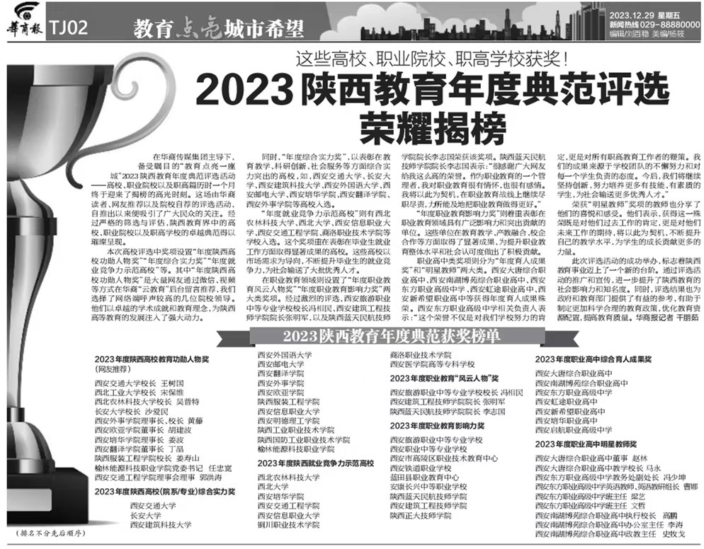 陕服新闻网讯(李文斌)2023年12月29日,备受瞩目的“教育点亮一座城”2023陕西教育年度典范评选活动结果揭晓,经过严格的筛选与评估,陕西教育界中的高校、职业院校以及职高学校的卓越典范得以璀璨呈现。
