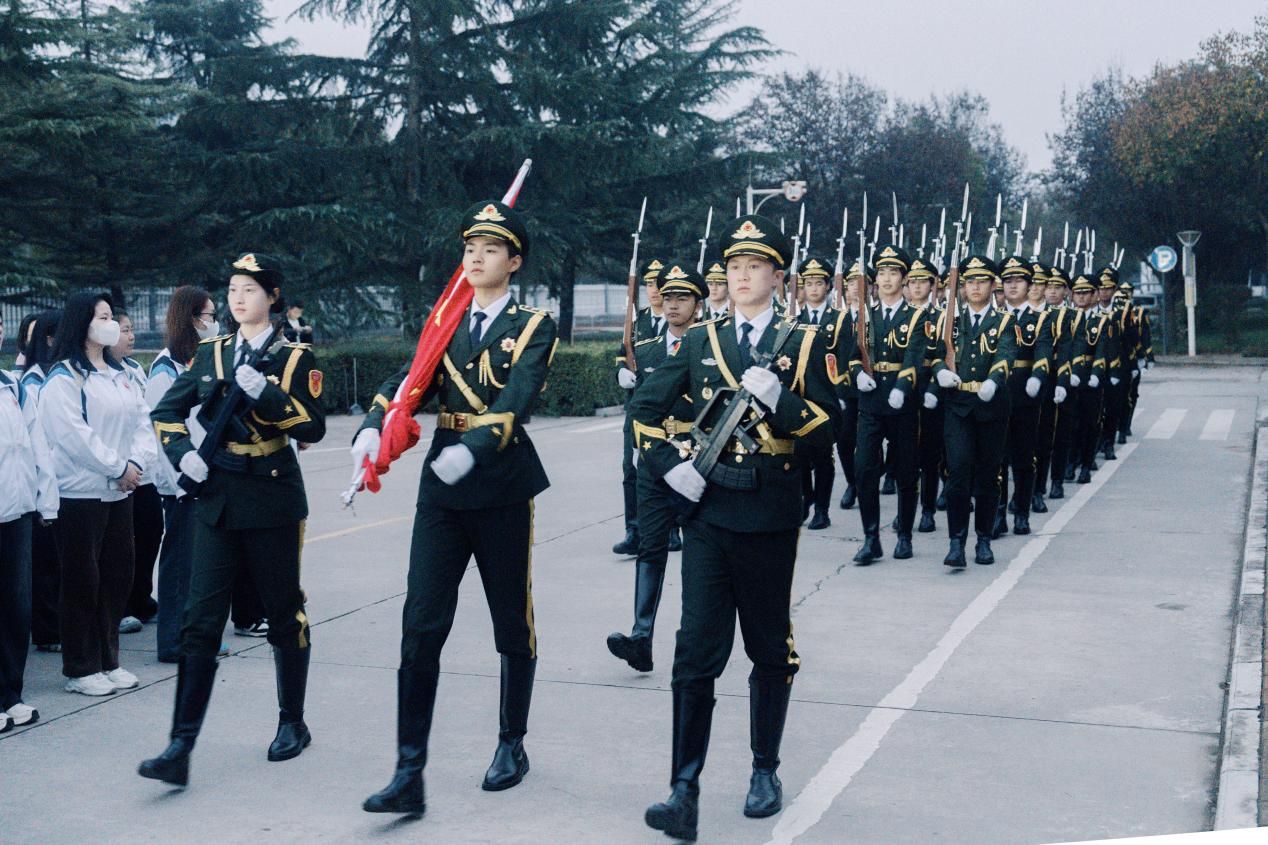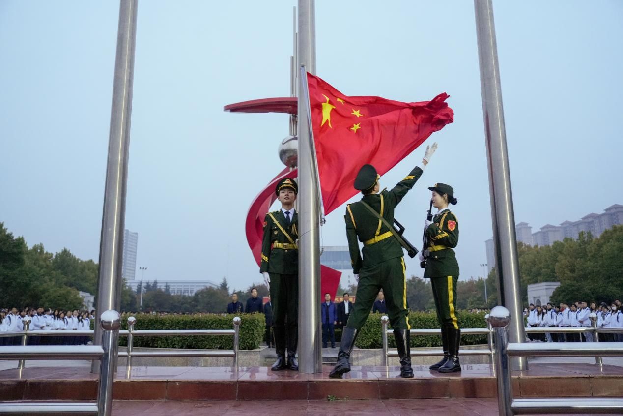 国旗护卫队以铿锵步伐护卫着国旗前行,伴随着激昂的《义勇军进行曲》,迎旗手虔诚而庄重地将国旗扬起,鲜艳的五星红旗迎风飘扬。