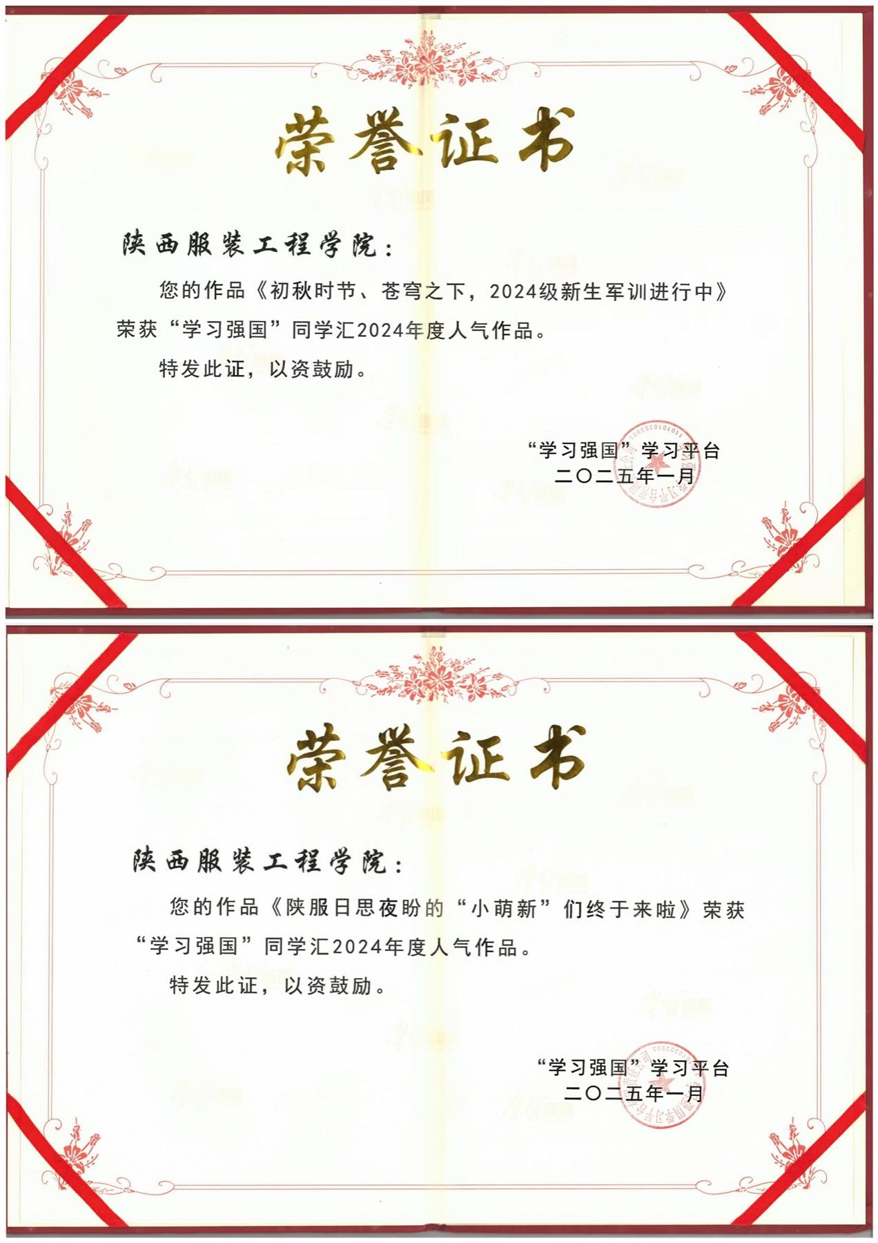 陕服新闻网讯(李文斌) 近期,“学习强国”学习平台公布了“学习强国”同学汇2024年度人气作品(高校)Top100名单。我校《陕服日思夜盼的“小萌新”们终于来啦》《初秋时节、苍穹之下,2024级新生军训进行中》两作品获评“学习强国”同学汇2024年度人气作品。