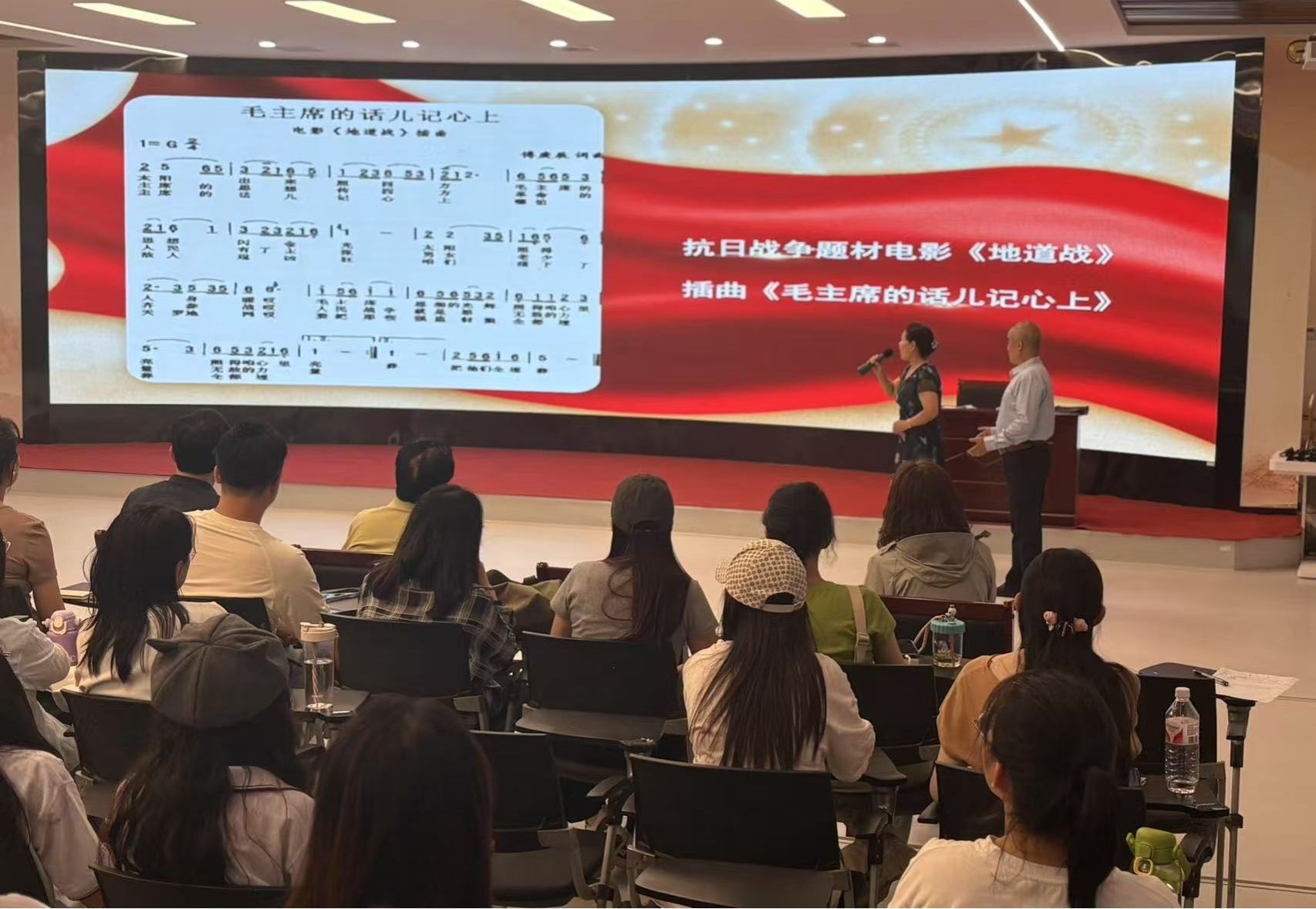 张平的党史学习教育讲座别开生面,以大量不同历史时期耳熟能详的经典红色歌曲为线索,配合生动讲述党史上和中国革命历程中一个个打动人心的革命故事,从牢记中国共产党的性质宗旨、弘扬伟大建党精神、永远跟党走、把学习贯彻习近平新时代中国特色社会主义思想不断引向深入等方面,让党的历史进程在歌声中愈发清晰,把党的百年历程和伟大精神深深地烙印在每一位师生的心中。张平深情演唱《三大纪律八项注意》《山丹丹开花红艳艳》《红日》和《我的祖国》等脍炙人口的歌曲,与李金兰和徐丽兰两位老师共同演唱了《映山红》和《毛主席的话儿记心上》,陈展昭老师现场担任指挥,大家仿佛回到了那个峥嵘岁月,深刻感受到了中国共产党领导下的革命精神和奋斗历程。讲座现场师生互动频繁,气氛热烈。