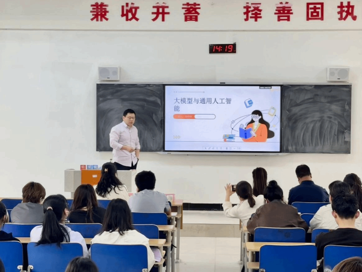 启动仪式后,首场专题讲座《大模型与通用人工智能》正式开讲。本场讲座由校企合作单位西安粤嵌信息科技有限公司高级工程师主讲,分别从DeepSeek对AI行业的冲击、大模型的核心技术、未来展望与行动建议和大数据的通用潜力与AGI挑战等方面进行了前沿知识与科技的普及。通过播放大国重器的两个事例,更好的让同学们了解人工智能对我们生活的影响,弘扬中国制造业的创新精神,激励更多人投身到科技创新事业中。现场互动热烈,师生纷纷表示受益匪浅。最后,付院长作总结讲话。她表示,学院将持续邀请学界与业界专家开展前沿技术分享,助力培养适应未来科技变革的高素质人才。